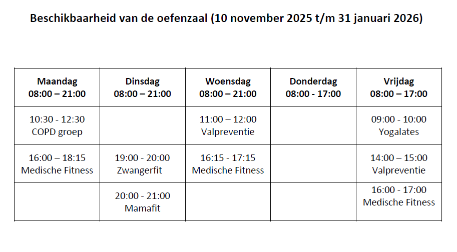 Let op: gedurende de Valpreventiecursus (10 november 2025 t/m 31 januari 2026 geldt er een aangepaste beschikbaarheid voor de oefenzaal: